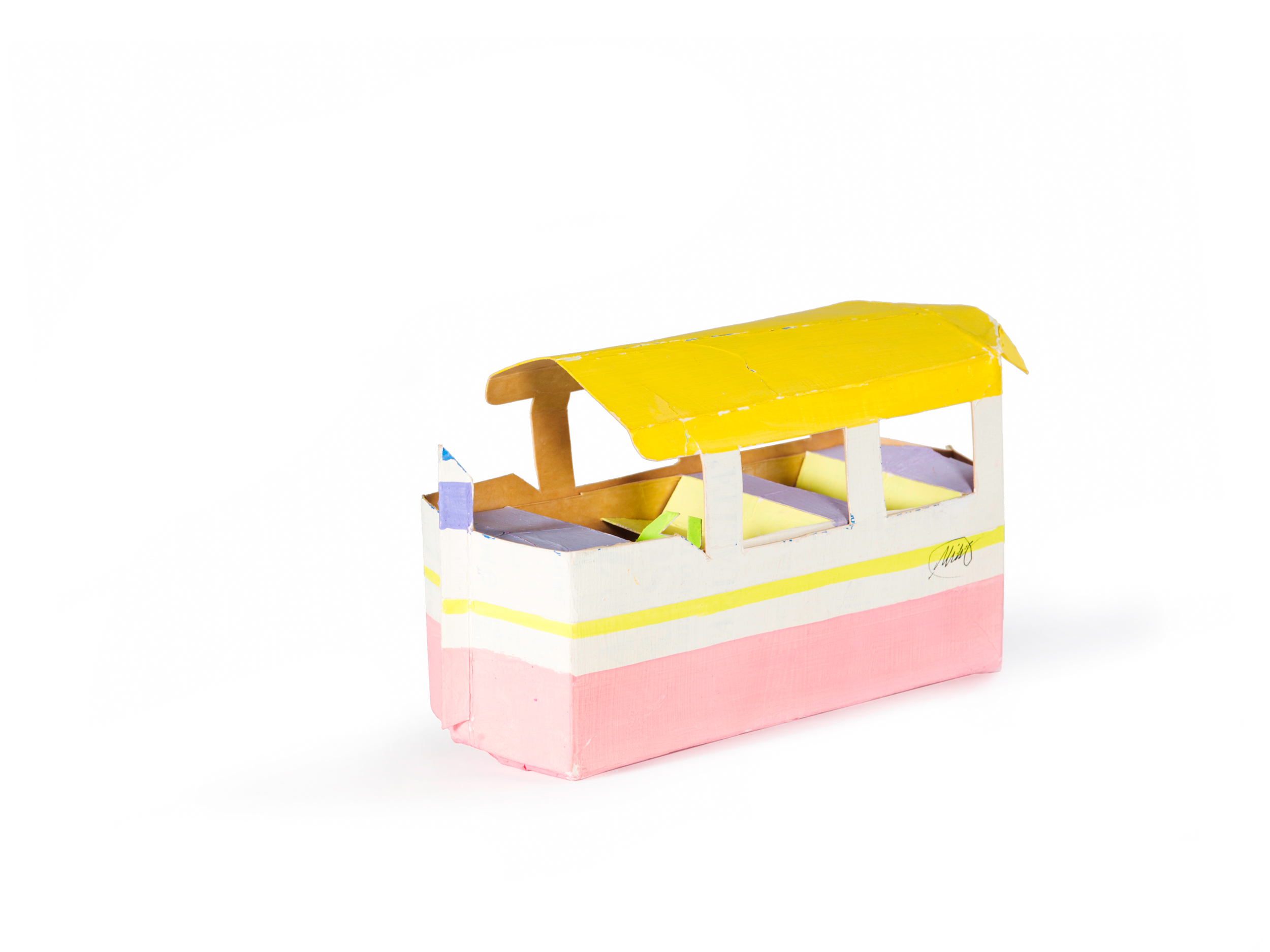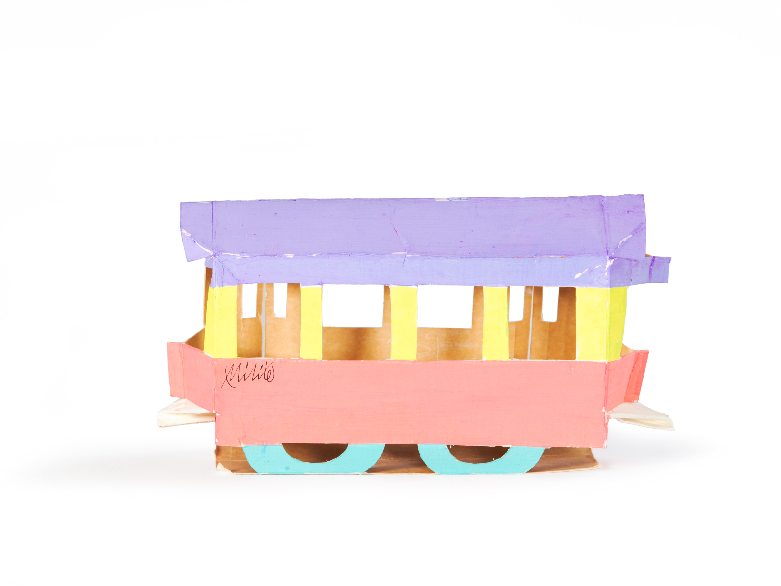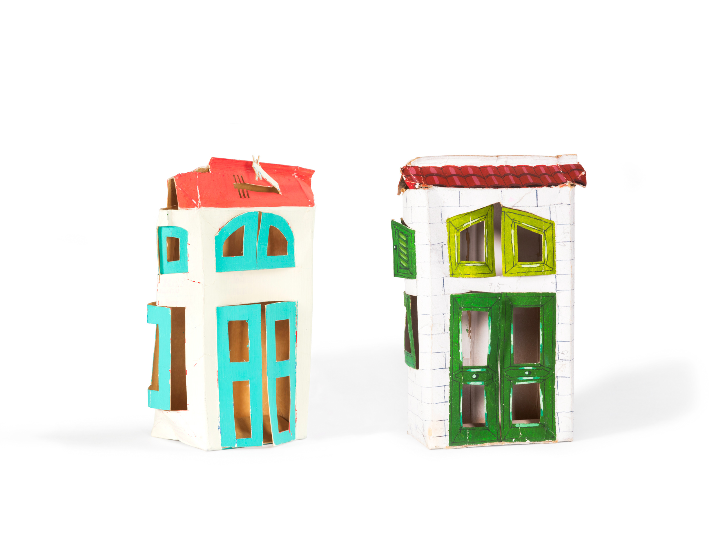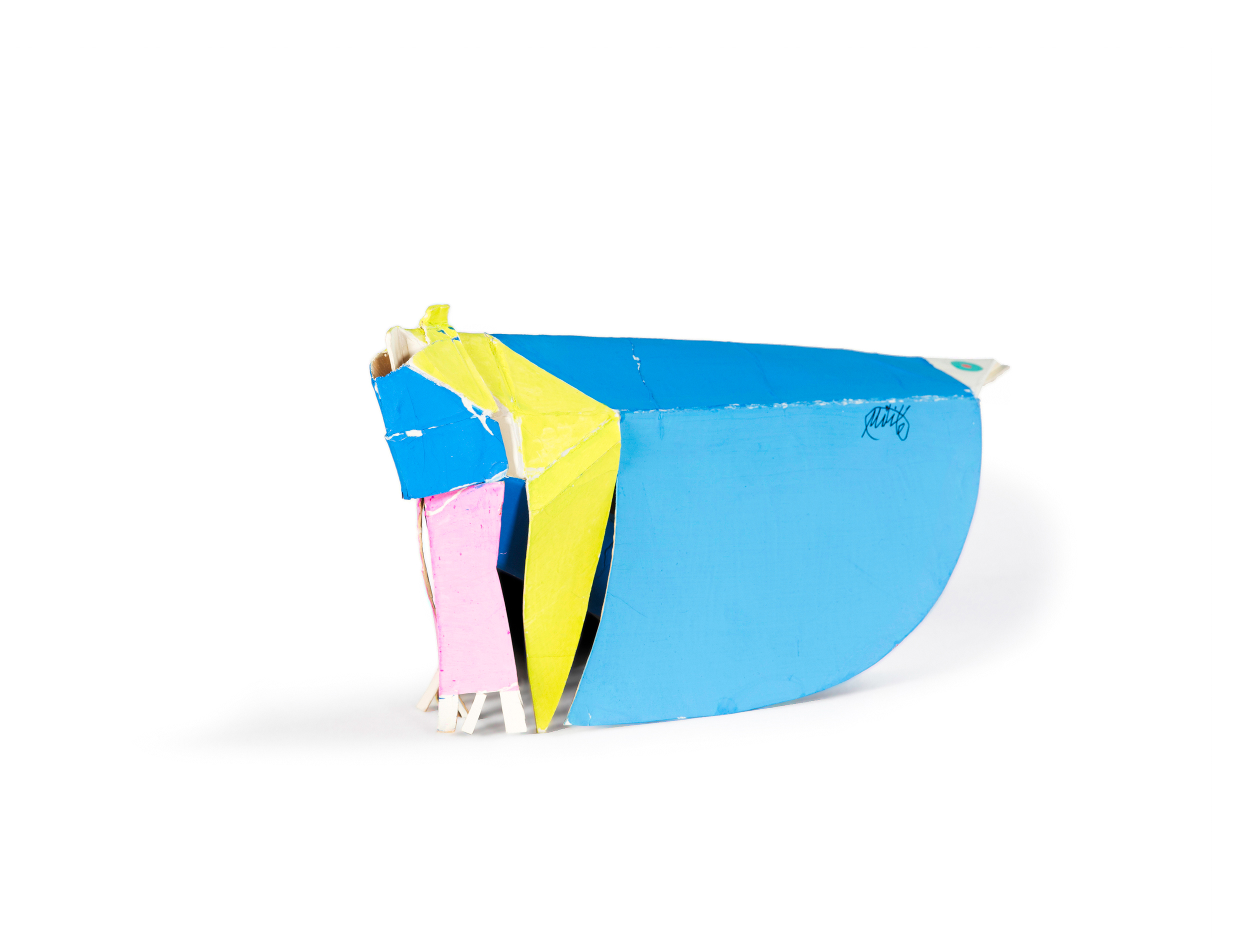 “Una parte della mia ricerca mi porta, con diverse tecniche e materiali, alla trasformazione dei contenitori. Dai più piccoli, come le scatole delle lampadine o del latte, ai “contenitori edilizi”. Tento di modificare qualsiasi tipo di scatola, non importa di quale dimensione sia. Se riesco ne cambio la forma e la destinazione d’uso. E spesso scopro che è nata per giocare e far giocare. Quelle del latte, i “tetrabrik”, diventano, senza opporre troppa resistenza, elefanti o battelli, musi di pantera, granchi e trenini…Con qualche taglio e poche pieghe, le scatole delle lampadine rivelano addirittura un’occulta identità di caccia bombardieri. Altri piccoli contenitori cartacei, come quelli delle saponette, non vedono l’ora di fare da personaggi umani, e la coppetta del gelato, poi sembra progettata apposta per fare da Piccolo Teatro.” Tonino Milite